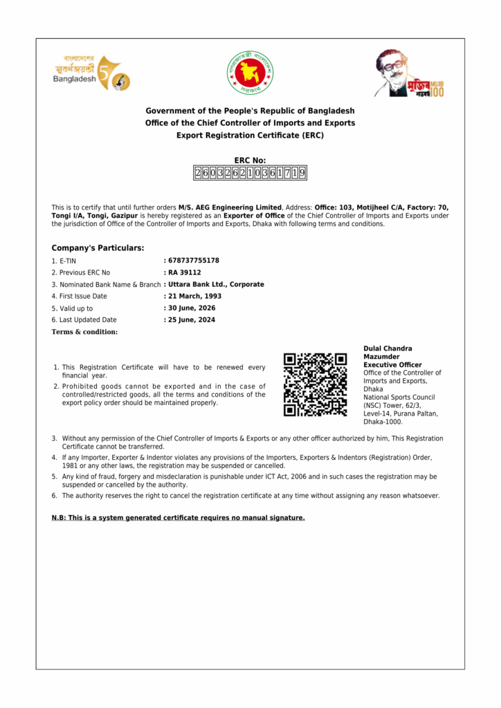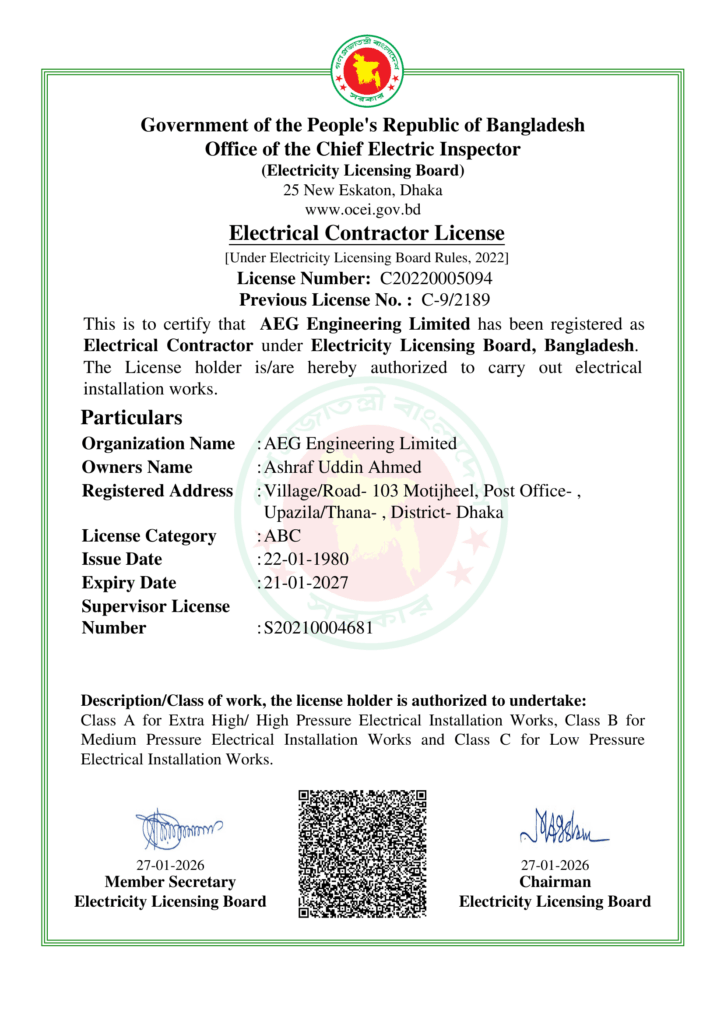 In addition, AEG Engineering Ltd. executes major turnkey electrical projects including HT/LT panels, outdoor substations, transformers, and generator installations. Combining strong German heritage with decades of local expertise, the company continues to play a vital role in supporting Bangladesh’s industrial and power sector growth, delivering innovative solutions and reliable services that drive progress and development across the nation.